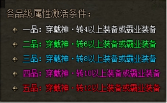 1)经过炼体获得的属性并不会立即加入玩家角色属性当中,而是需要通过穿戴对应神转生装备进行激活。穿戴的神转生装备等级越高,可以激活的炼体属性品级越高。霸业装备可激活任意品级属性。