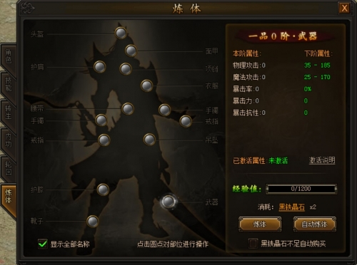 2)点击每个圆点,即可对圆点对应的部位进行炼体操作。每个部位分为五品,每品分为八阶。提升各个部位的炼体等级需要消耗黑铁、星辰、阳炎晶石,其中黑铁和星辰晶石可通过分解转生装备获得,阳炎晶石可通过分解霸业装备获得。
