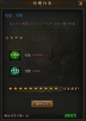 除魔任务为简单的杀怪任务,只要消灭指定怪物就可以快速完成啦。接取任务前,只要花费少许金币就可以刷新任务星级,星级越高,完成任务可以获得的奖励就越多,建议各个玩家最好刷新任务为满星后再接取。