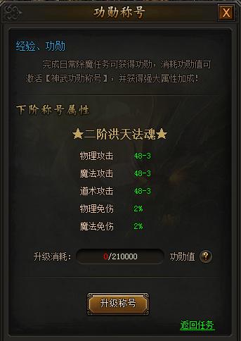 功勋值可以用来领取功勋称号,功勋称号可以不断升级,称号等级越高,给予的属性值提升越高。所以每天一定要记得做功勋除魔任务哦!
